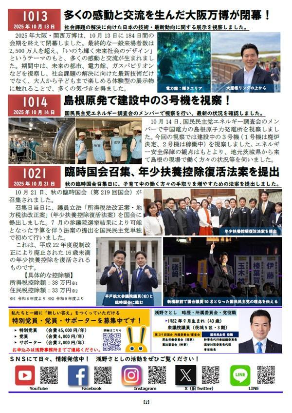 そのような中、国民民主党をはじめとする6党の実務者間で、ガソリン・軽油の暫定税率(揮発油税・地方揮発油税の暫定税率:25.1円/ℓ、軽油引取税の暫定税率:17.1円/ℓ)を本年12月31日(軽油は来年4月1日)に廃止することについて合意がされました。まさに、国民の声が政治を動かした歴史的な政策実現であり、国民民主党はこれからも「対決より解決」の姿勢で、実効性のある政策を前進させることに全力で取り組みます。地域の声をしっかり国政に届け、現場に根ざした改革を確実に実行してまいりますので、引き続きご支援を宜しくお願いいたします。