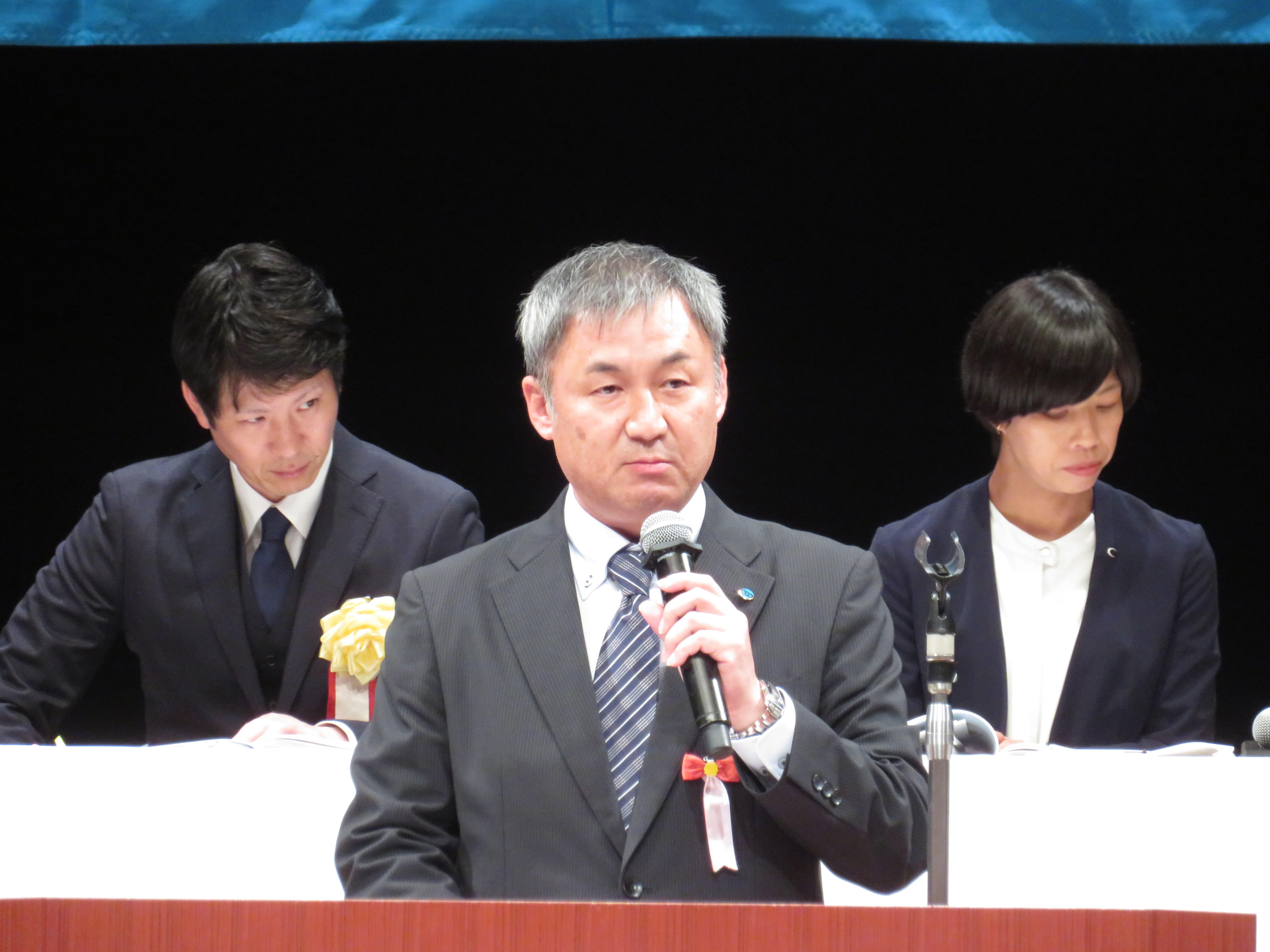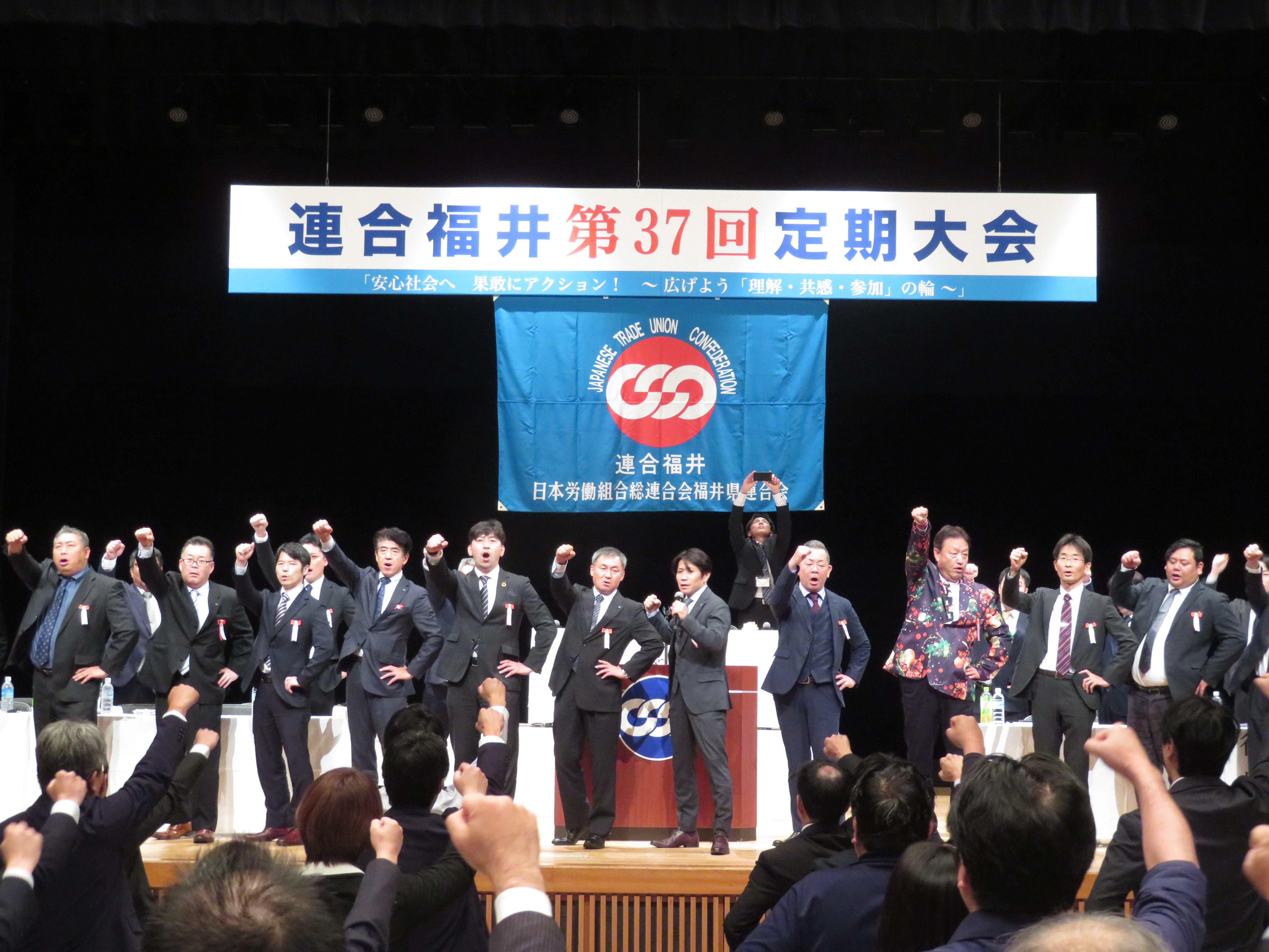 任期満了に伴う連合福井の役員改選の結果、今大会をもって電機連合出身の矢野義和会長が退任し、自治労出身で連合福井の事務局長を務めていた橋岡克典氏が新会長に就任、電機連合出身で電機連合福井地方協議会で事務局長を務めていた山田佐智生氏が新事務局長に就任しました。