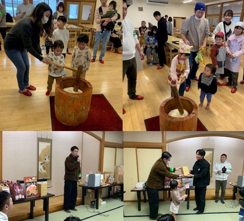 また、餅つきでは、合計6臼分のもち米を、33名のお子さんたちも一緒についてくれました。日常ではなかなかできない貴重な体験になったことと思います。つきたての餅は、きなこや大根おろしで味付けし、おいしく味わいました。