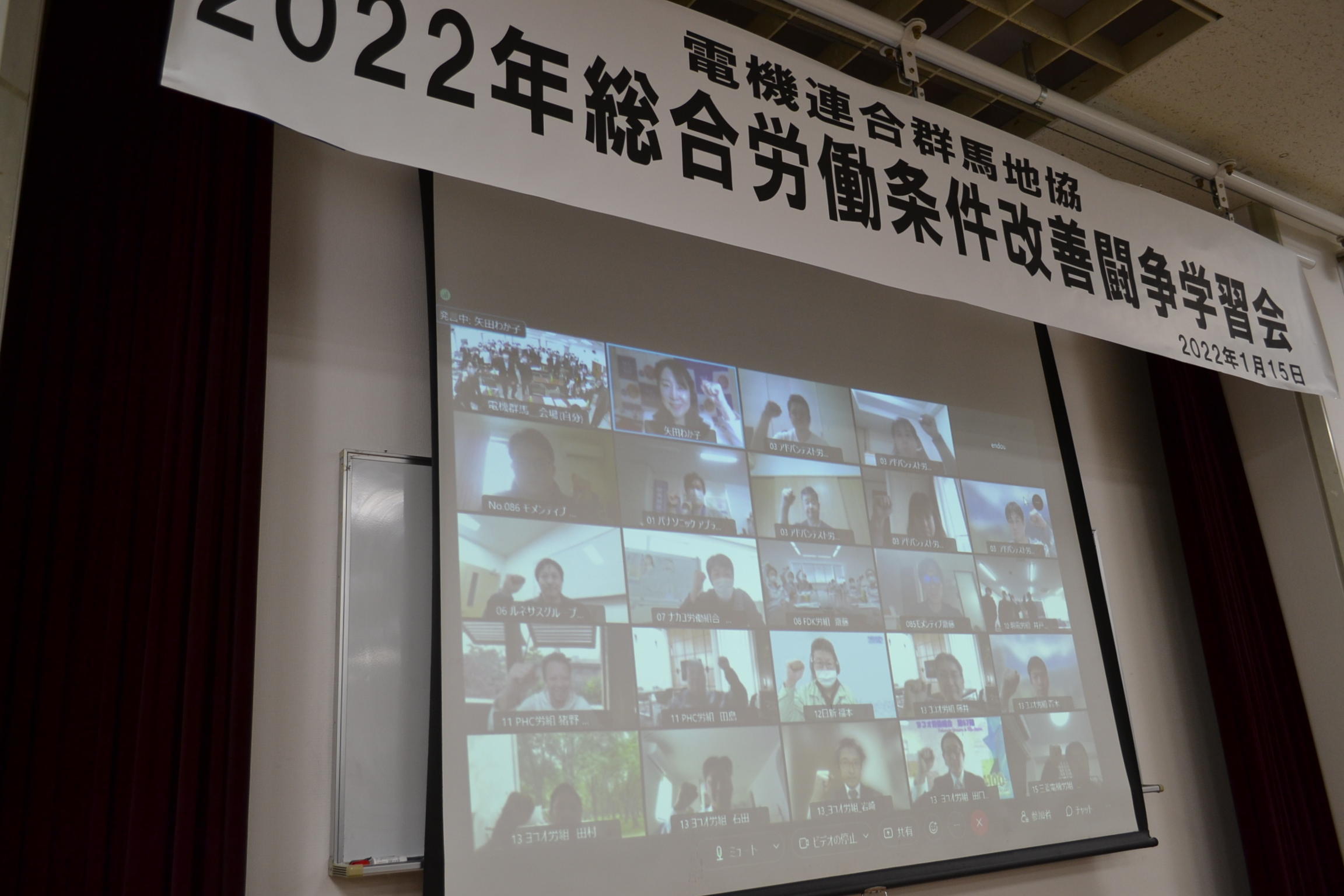 1月15日(土)群馬県勤労福祉センター、Web会議併用にて、「2022年総合労働条件改善闘争学習会」開催しました。電機連合の大崎中執より第108回中央委員会議案について、ご説明頂きました。その後、引き続き大崎中執より「労働関係諸法に関する学習会」と題し労働・雇用法令の改正動向と電機連合の取り組みについて、ご講演をいただきました。 また、矢田わか子参議院議員より国政報告をいただき、参加者からの質疑にお答えいただきました。