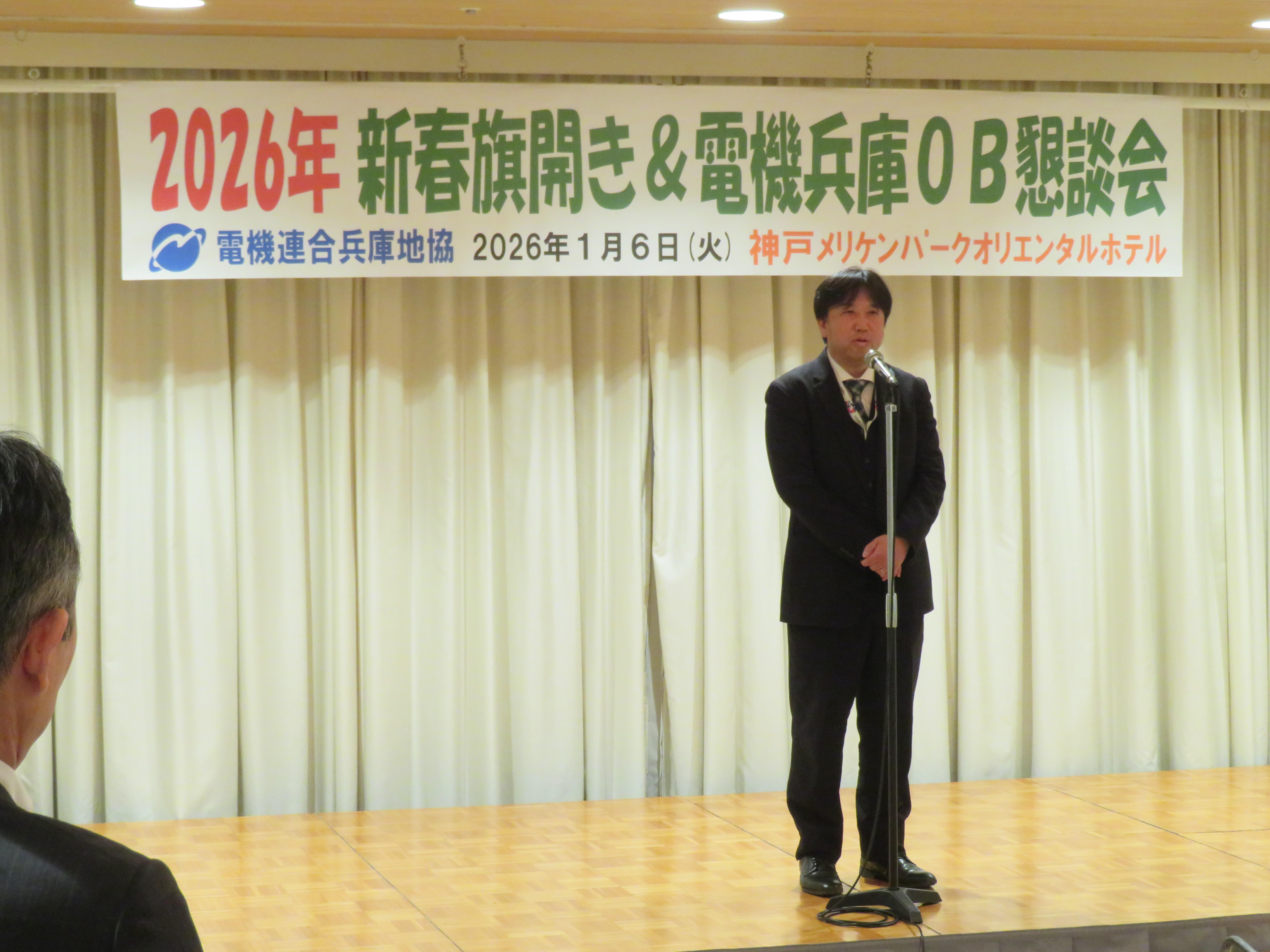 1月6日(火)に神戸メリケンパークオリエンタルホテルにおいて2026年新春旗開きを開催しました。当日は、主催者代表挨拶に続いて、ご来賓を代表して連合兵庫那須会長、兵庫県産業労働部塩見次長、神戸市経済観光局大畑局長よりご挨拶いただきました。引き続き、電機兵庫OB懇談会開催し、代表して電機兵庫OB会大西副会長からご挨拶を頂きました。当日は、ご来賓、加盟組合役員、電機兵庫OB会 計45名のご参加を頂くことができました。