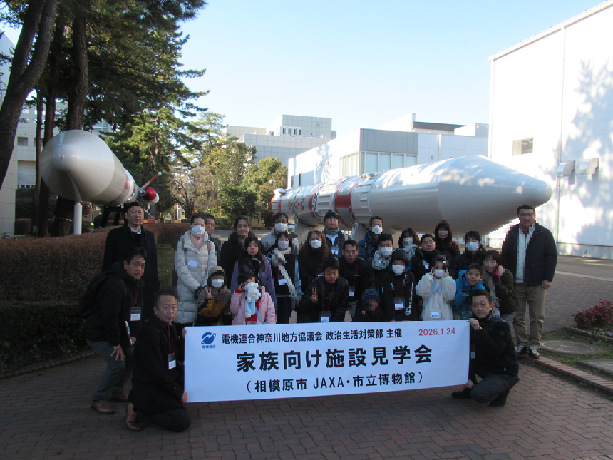 今回、宇宙科学研究の現場を知ることを目的として、JAXA相模原キャンパスにて研究設備や探査機展示を見学しました。また、相模原市立博物館では昨年7月にリニューアルしたプラネタリウム上映に加え、自然・歴史・宇宙に関する展示を通して理解を深めることができました。電機連合組織内議員団いちょう会会長の森しげゆき相模原市議会議員にもご臨席いただき、相模原市やいちょう会の活動についてお話を頂戴しました。