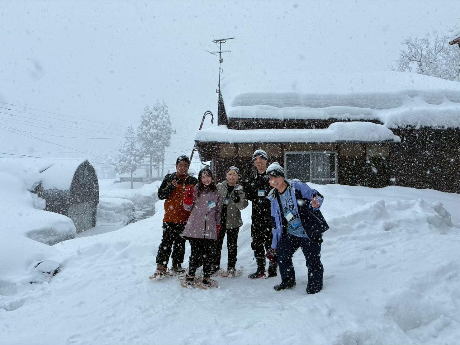 地元の方にかんじき(足が雪に深く入ることを防止する装具)の装着方法や、スノーダンプを使用した雪かきの手順・コツを教えていただき、初めての雪かきに戸惑いながらも、地元の方のサポートもあり、皆で協力しながら作業を完遂することができました。