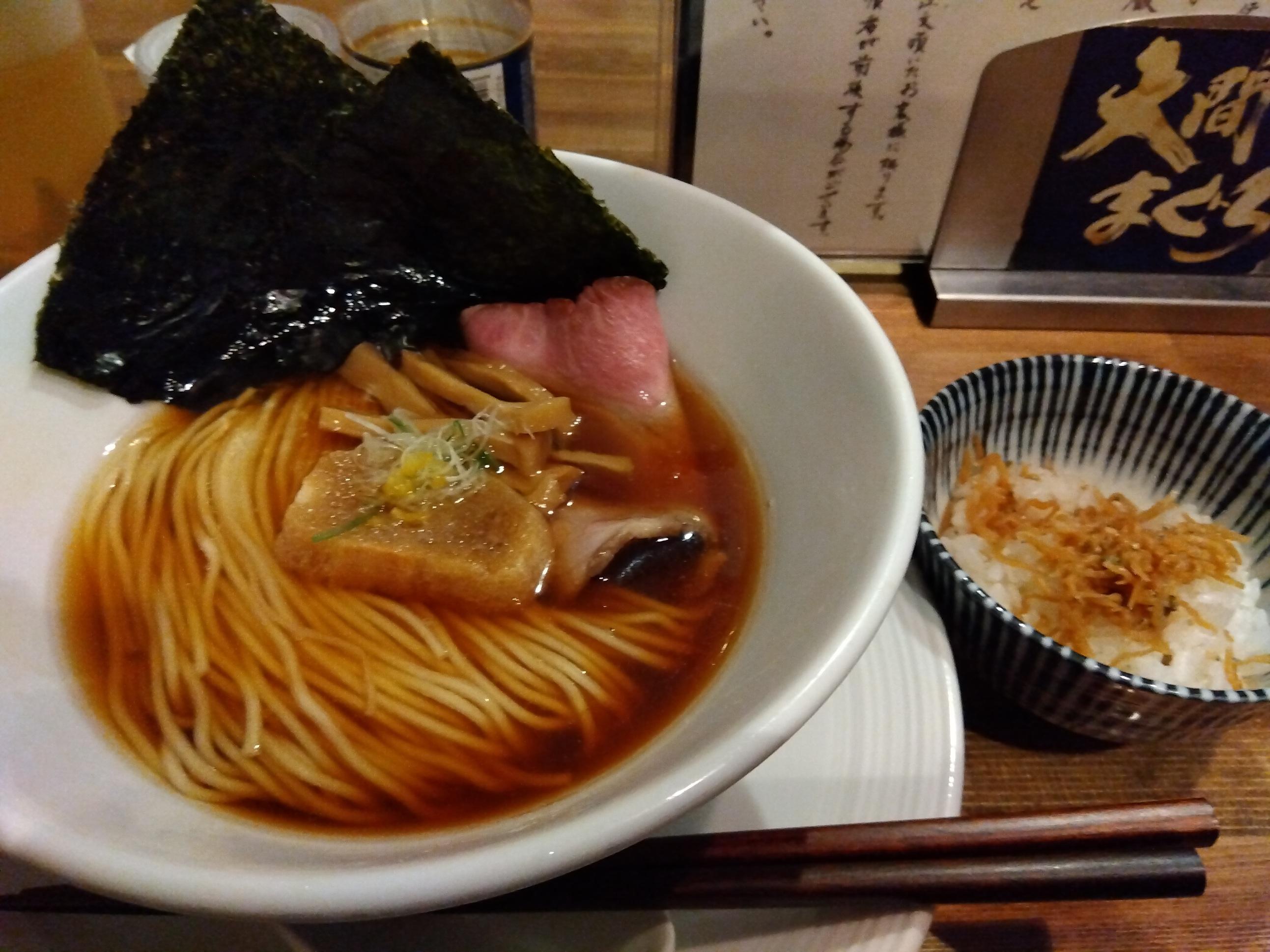 新橋で青森を堪能できる居酒屋で、「中華蕎麦」はランチ限定です。津軽煮干し中華蕎麦。麺はストレート。真ん中はお麩。味玉は苦手なので抜いてもらいました。中華蕎麦を注文したらプラス出来るご飯ものがあります。私は白ご飯(+150円)を追加しましたが、他に八戸前沖サバ棒寿司や、ねぶた漬け丼もあります。
