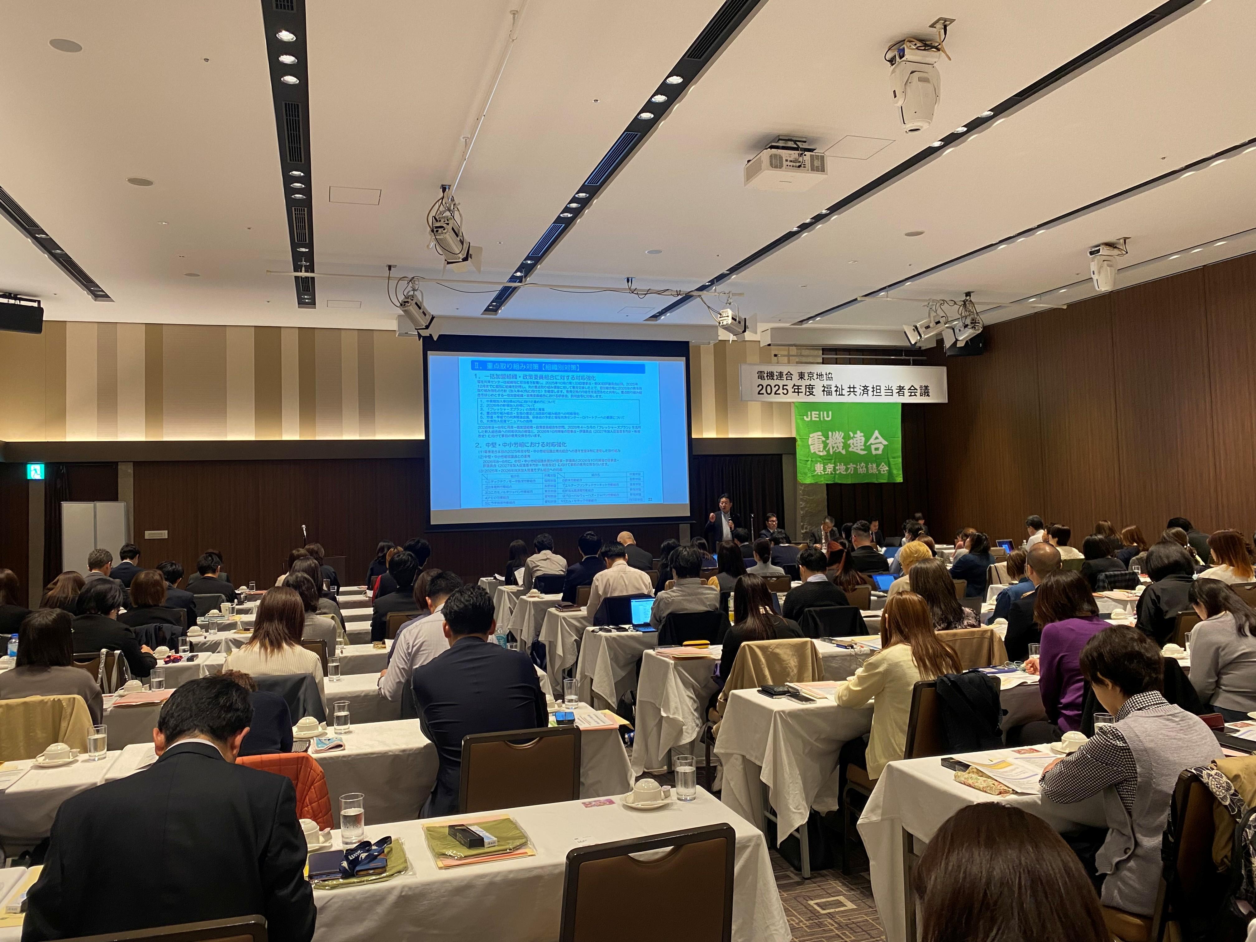 第1部では、電機連合福祉共済センター・東京海上日動火災から2025年の加入促進基本方針、各制度の取り組み内容、Dパートナー(けんこう共済代理店)からWITHシートの活用等、こくみん共済coopからファミリーサポート共済の加入状況、マイカー共済の取り組みについて等、中央労働金庫東京都本部から財形の廃止が多い中で、労金で預金に切り替え、就職内定応援ローンの話等3時間半にわたり、ご説明頂きました。