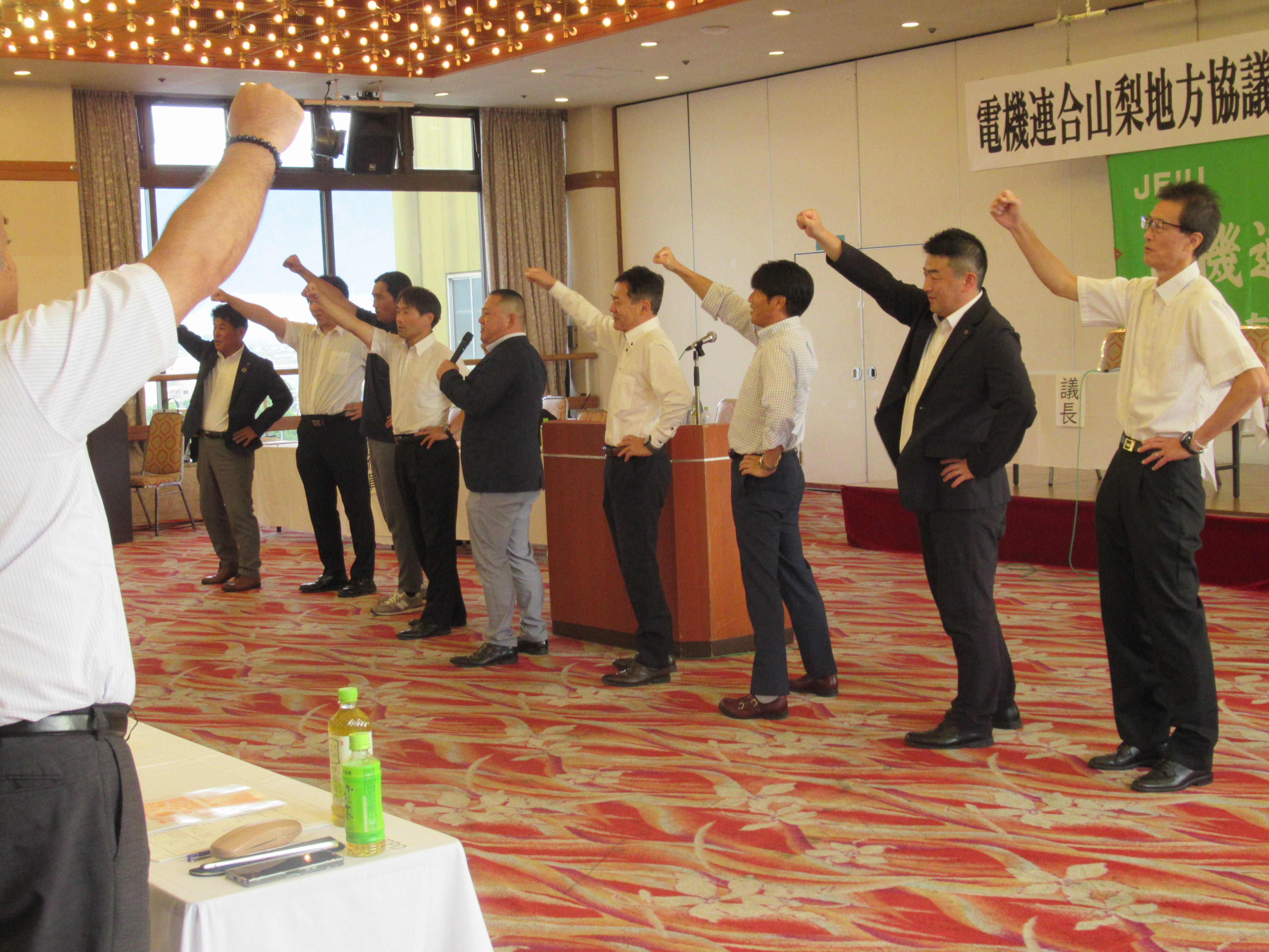 今大会の来賓については、電機連合本部より内田中央執行委員、連合山梨より窪田会長、中島衆議院議員事務所より田中様、槙野山梨市議、国民民主党山梨県連 渡辺幹事長、中央労働金庫山梨県本部 渡辺統括部長、こくみん共済coop山梨推進本部 萩原本部長にご臨席いただき、ご挨拶を賜りました。また、平戸航太参議院議員、後藤斎参議院議員からは大変お忙しい合間を縫ってWEBにてご挨拶を頂戴しました。